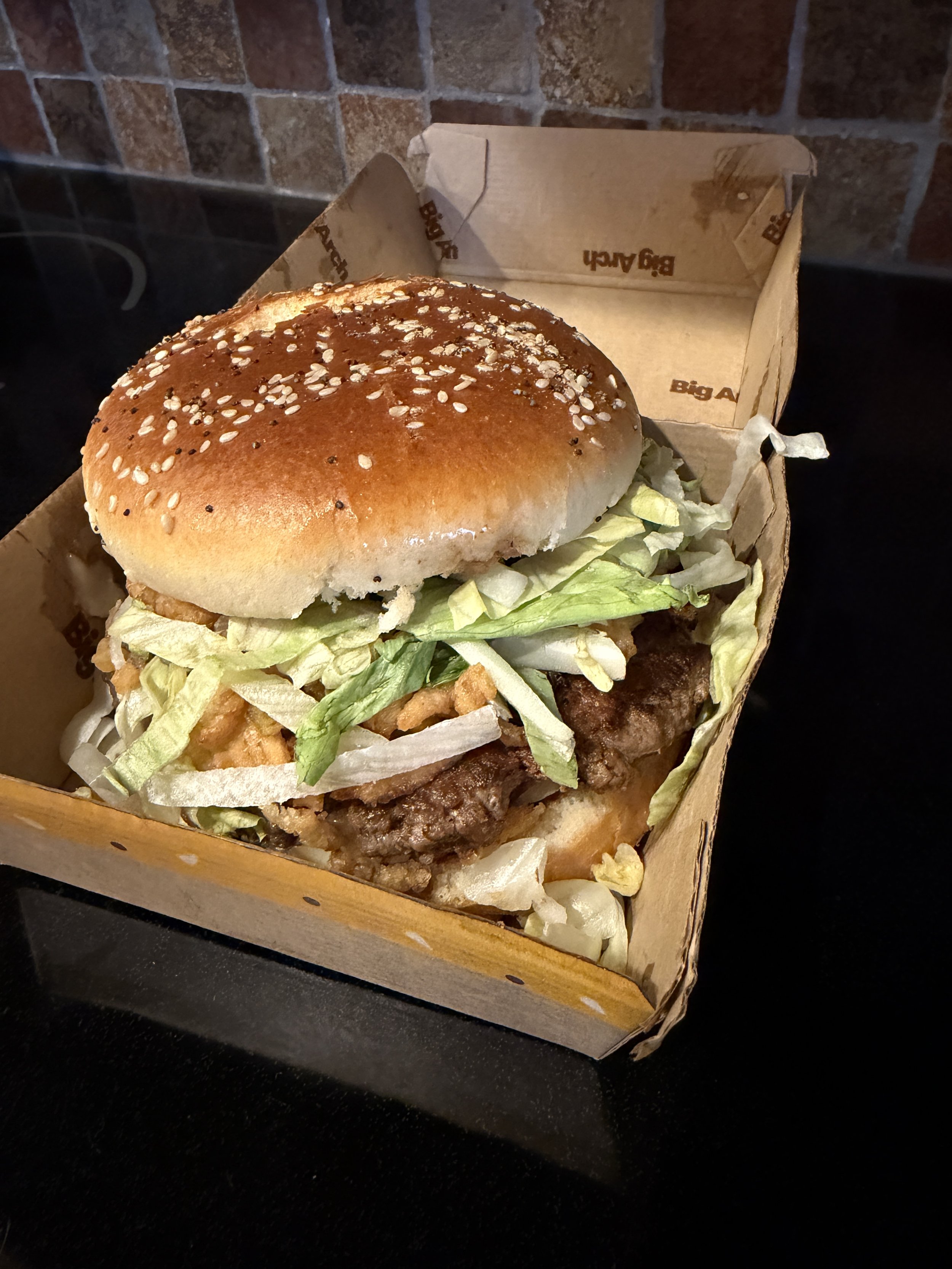 Anyway, I was able to secure a Big Arch ahead of its nationwide launch tomorrow, and I have thoughts. McDonald’s describes the new sandwich as spicy and slivered onions, zesty pickles, and crisp lettuce, but what truly sets it apart is the new BIG ARCH Sauce—tangy, creamy, with the perfect balance of mustard, pickle, and sweet tomato flavors. All served on a toasted sesame and poppy seed bun, making each and every big bite equal parts juicy, melty, and saucy.” *